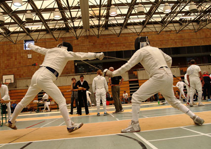 | ... während für das Fechten die große Sporthalle des SSF Bonn zur Verfügung stand. Gefochten wurde auf 10 Bahnen mit dem Degen jeder gegen jeden auf einen Treffer. Professionelle Kampfrichter und eine perfekte Organisation ließen diese Diziplin auch bei einem Rekord-Teilnehmerfeld von 36 Fechterinnen und Fechtern bei den Fünfkämpfern und 30 Fechtern/innen bei den Vierkämpfern in knapp 3 1/2 Stunden über die Bühne gehen. |